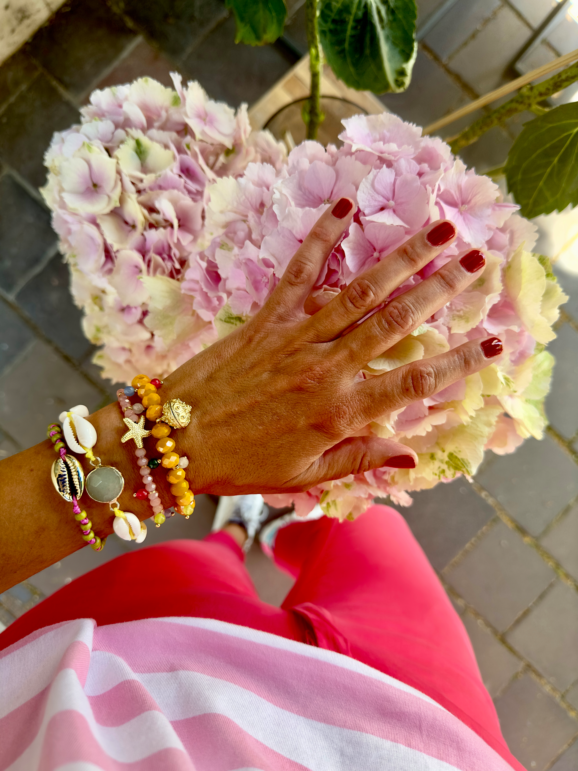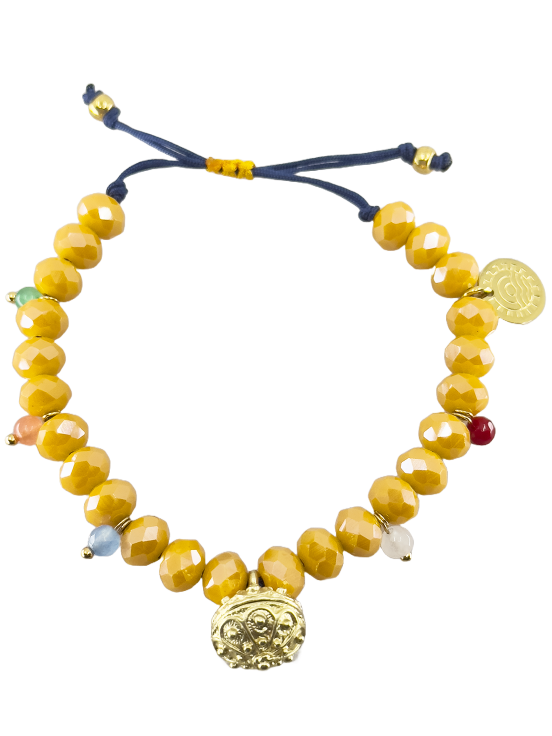 Halte mit dem Armband Aranciata einen Hauch von mediterranem Flair am Handgelenk fest! Die orangenen und bunten Glasperlen sowie der vergoldete, typische mediterrane Anhänger verleihen jedem Outfit einen tollen Look.
