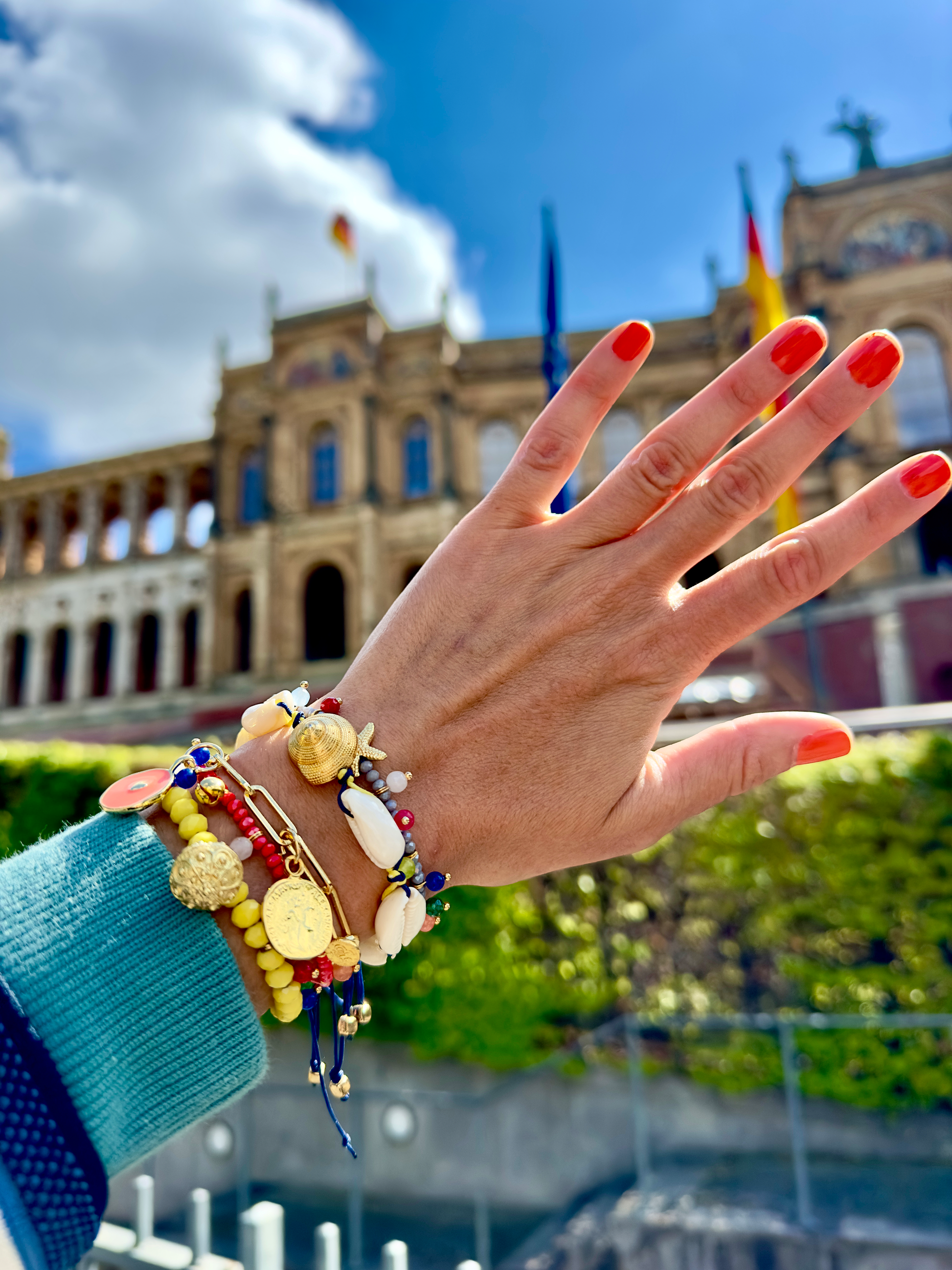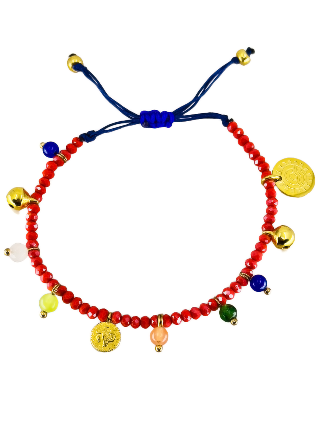 Dieses Armband ist ein wirklicher Arm-Candy. Es besteht aus 3 vergoldeten Elementen sowie roten und bunten Glasperlen.