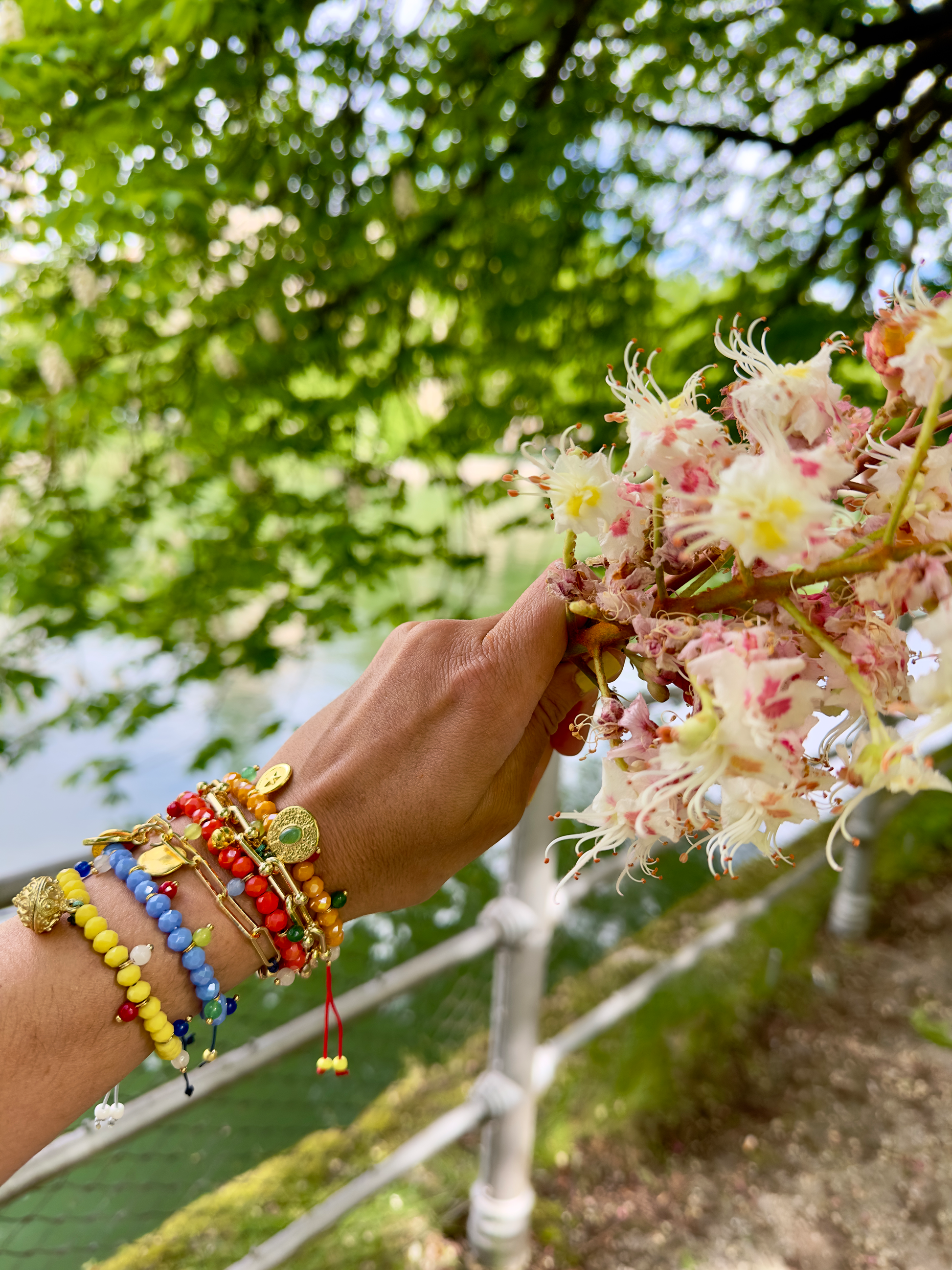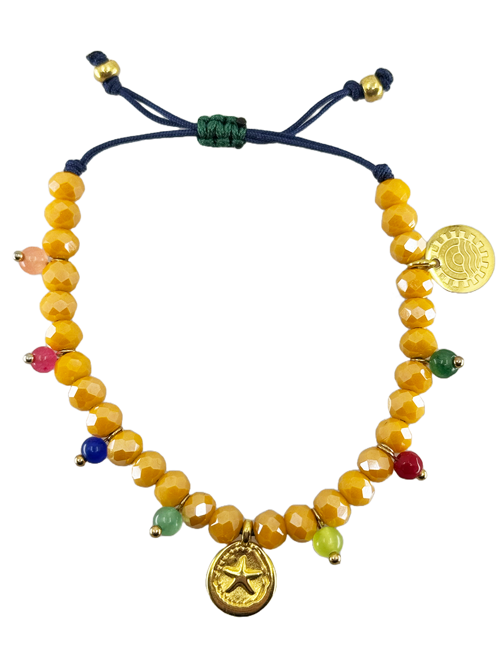 Erinnere dich mit dem San Sebastian Armband an den Geschmack des spanischen Käsekuchens mit orangenen und bunten Perlen sowie einem vergoldeten Plättchen. Ein Hauch von Spanien am Handgelenk!
