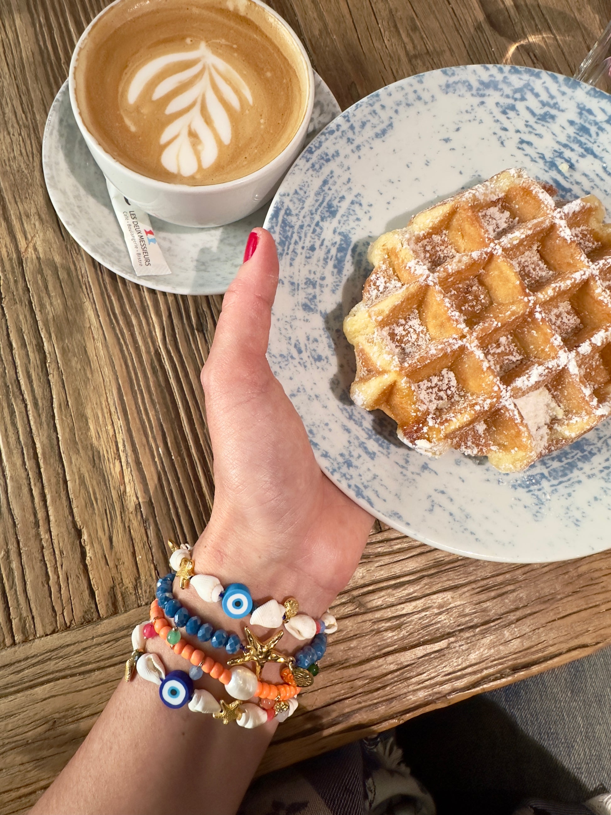Das Armband "Festeggiamo!" besteht aus Muscheln, einem Nazar-Auge sowie vergoldeten Anhängern und kleinen bunten Perlen.