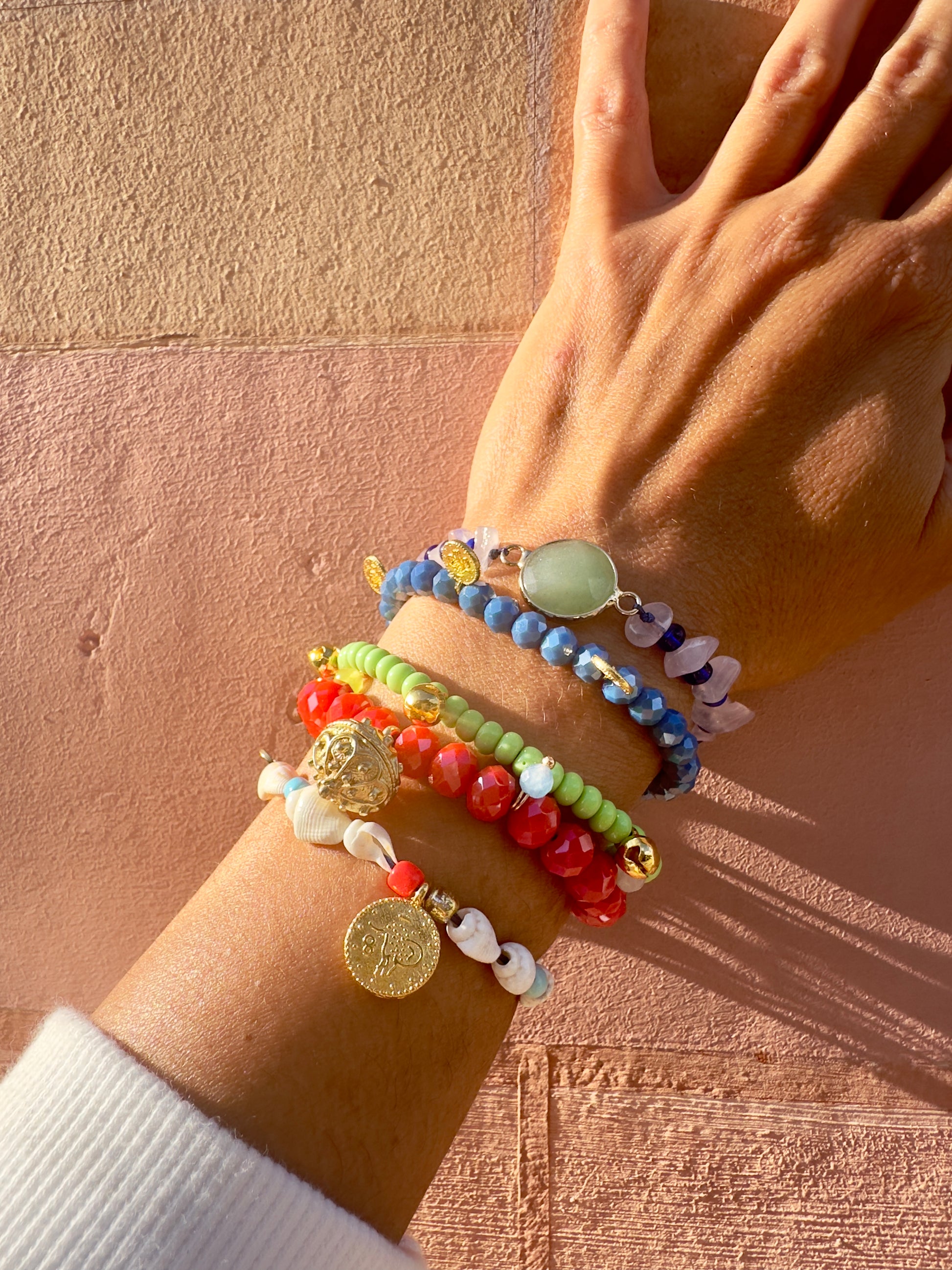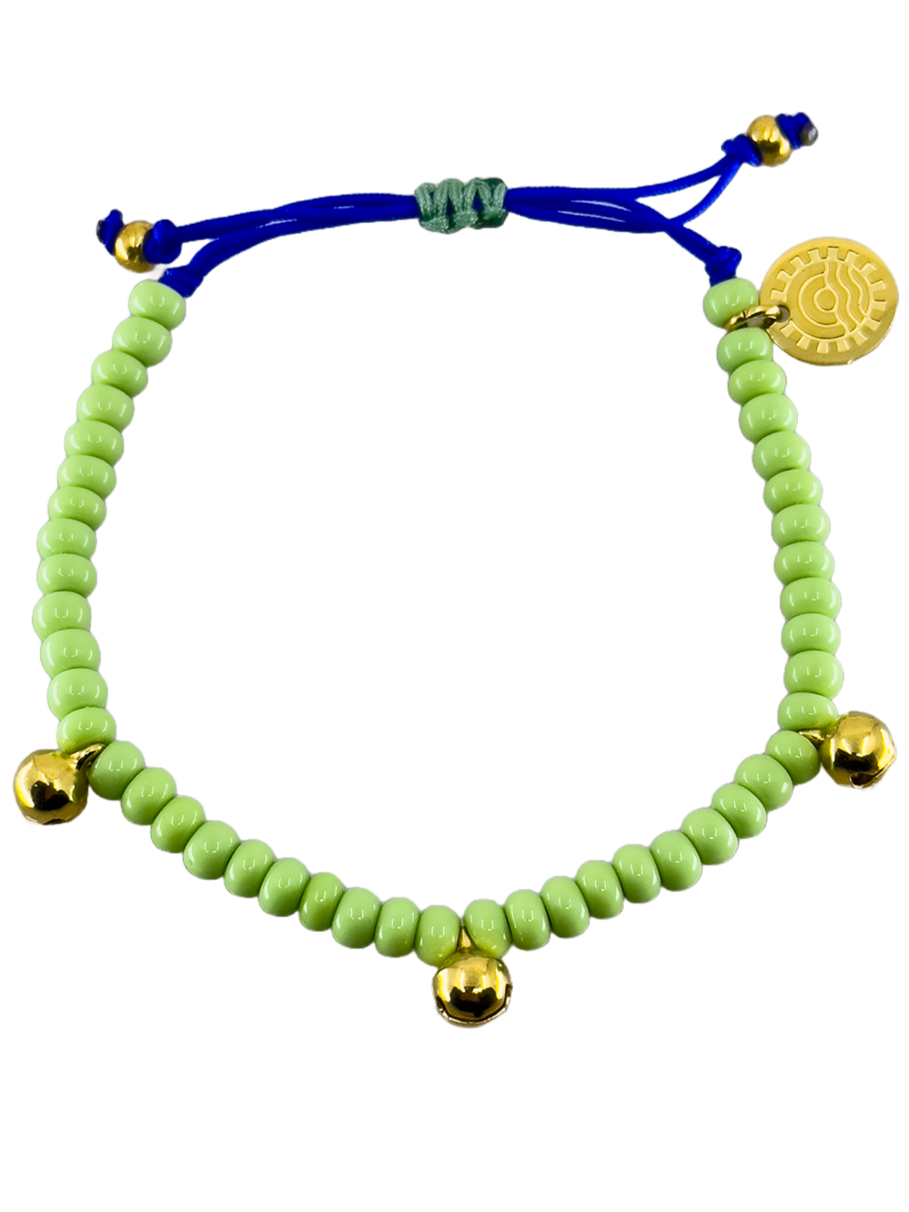 Steigere dein Accessoire-Spiel mit Fresh Limetta! Unser Armband ist mit grünen Perlen und 3 vergoldeten gypsy style Bällchen verziert und verleiht deinem Outfit das gewisse Etwas.
