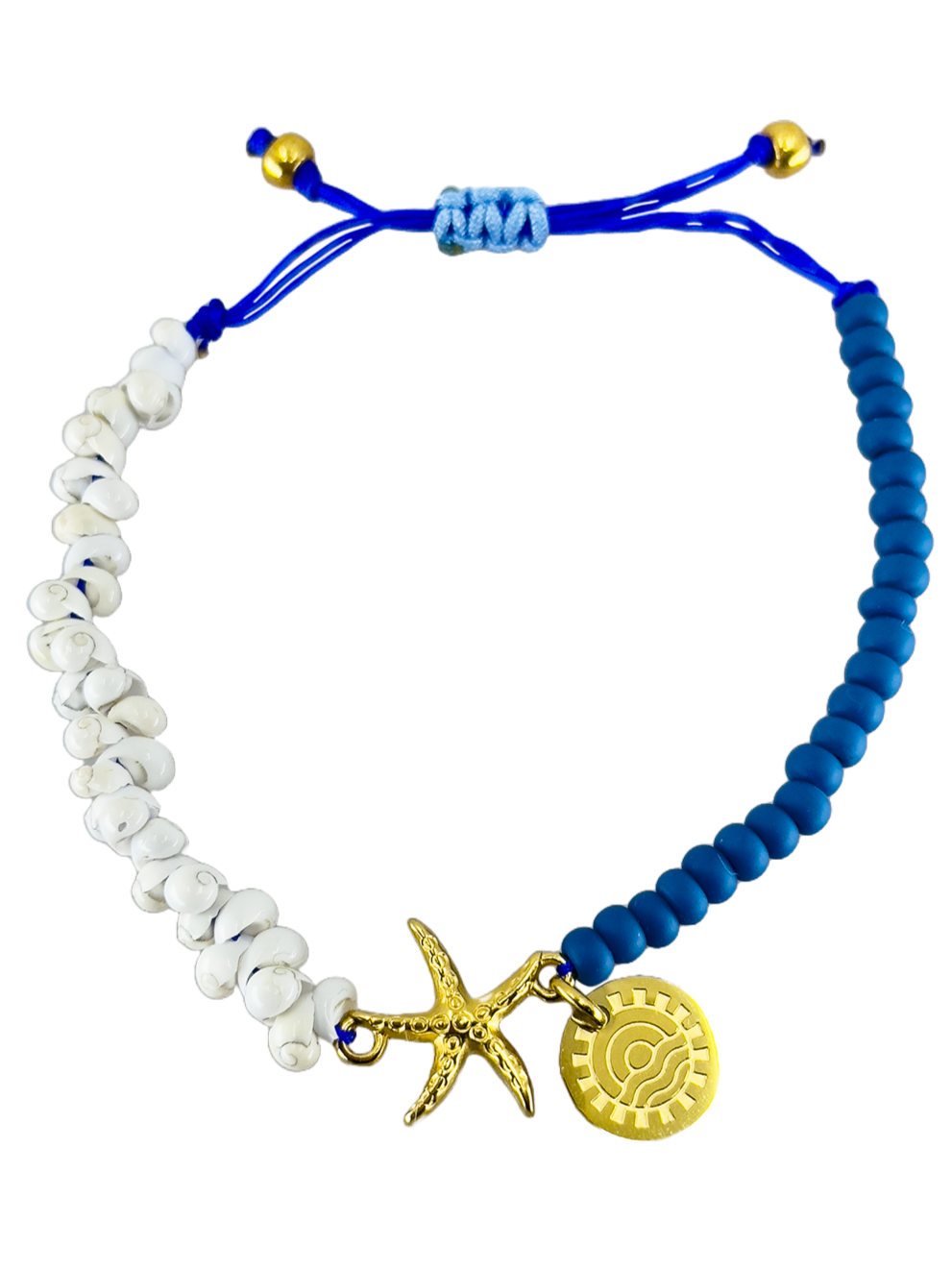 Das Armband "On the Beach"mit blauen Perlen & weißen Muscheln sowie einem vergoldeten Seestern-Anhänger ist inspiriert von einem Tag am Strand.