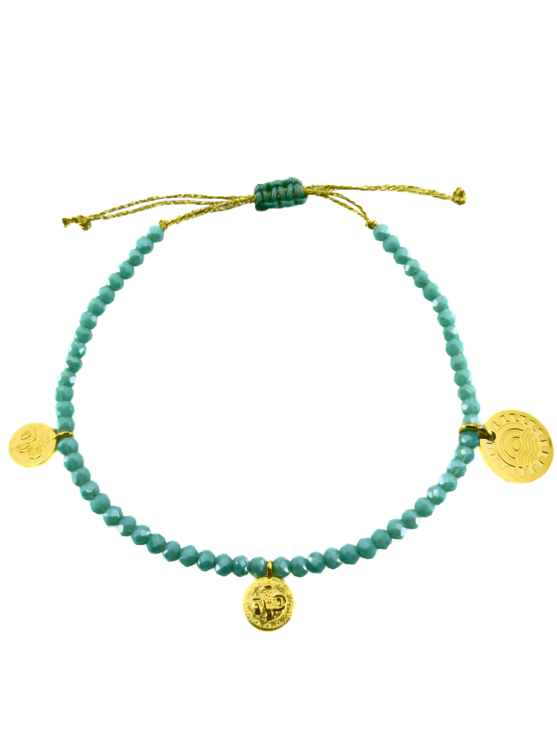 Das Armband besteht aus wunderschönen grünen azure Perlen und ist mit 2 goldenen Medaillons sowie dem "Marinero Moli Anhänger" verziert.