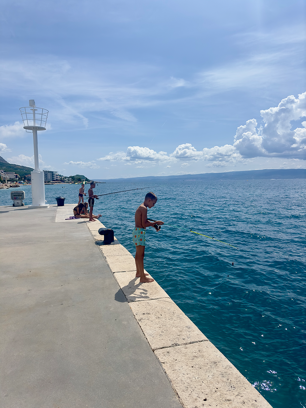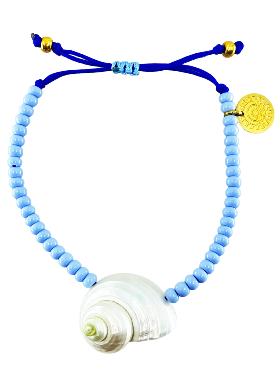 Der Blup Blup Armband kombiniert blaue Perlen mit einer großen weißen Muschel und bringt so einen Hauch von Meer in dein Outfit.