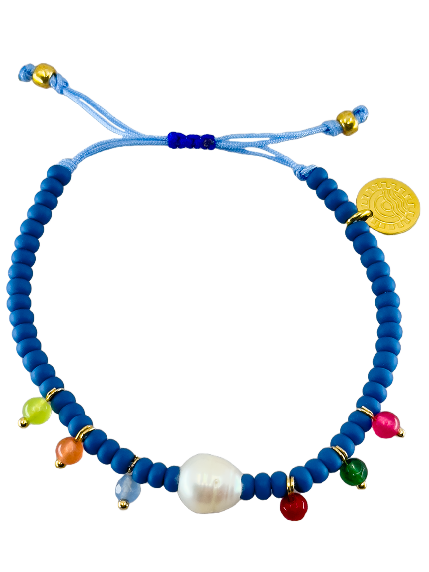 Das Armband By the Pool verbindet eine wunderschöne weiße Muschel mit blauen und bunten Perlen.