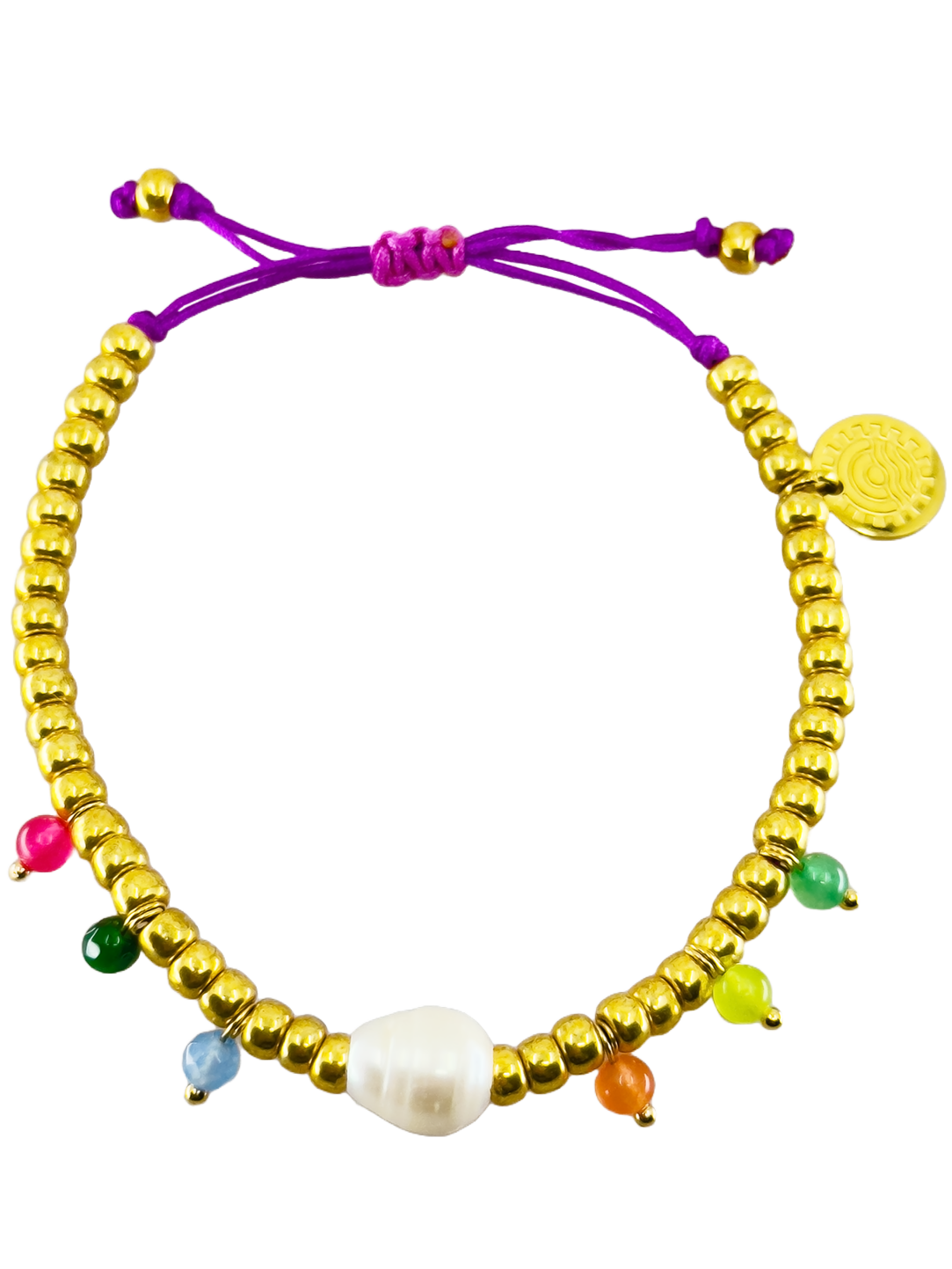 Das Armband By the Pool verbindet eine wunderschöne weiße Muschel mit goldenen und bunten Perlen.
