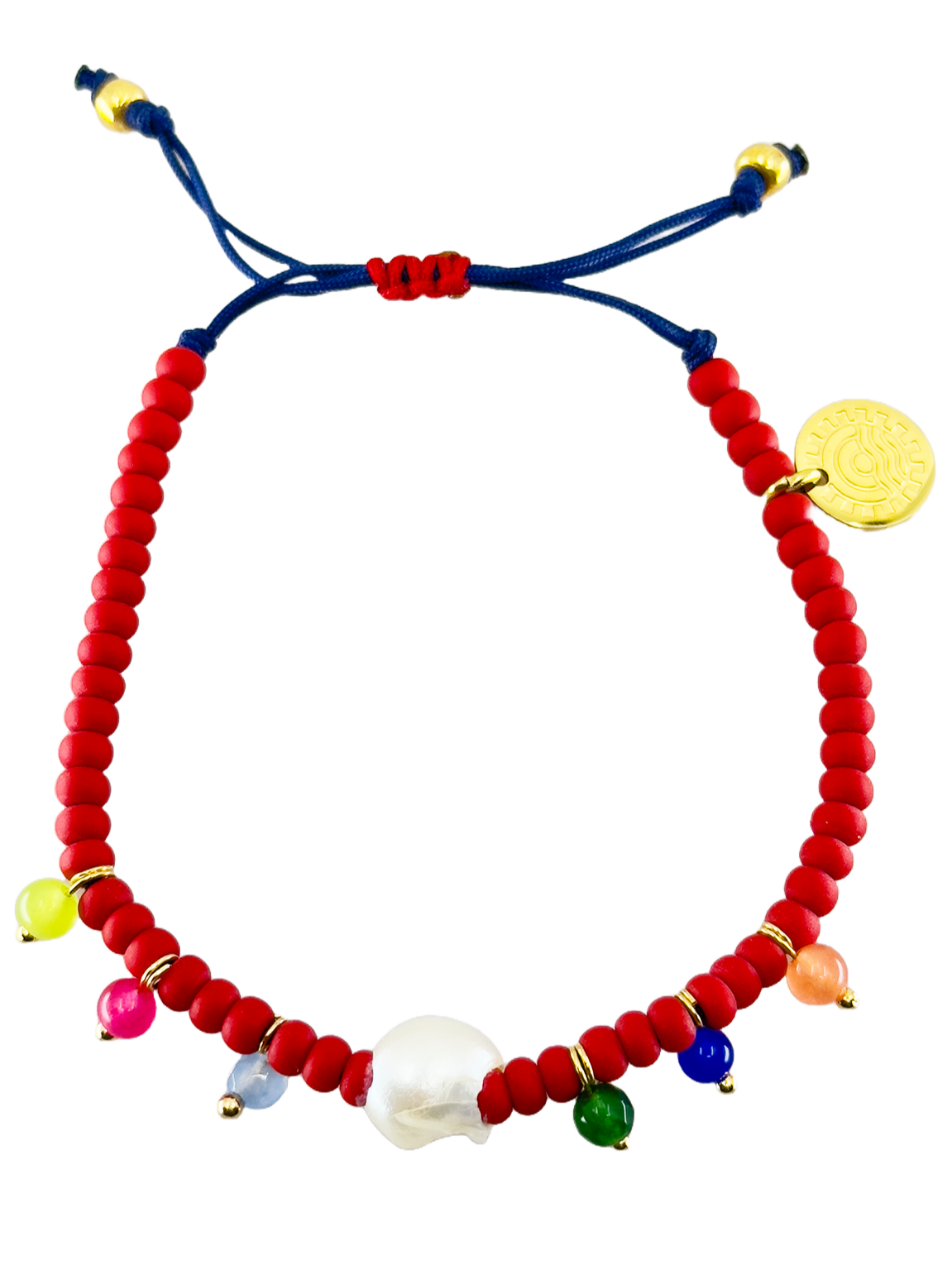 Das Armband By the Pool verbindet eine wunderschöne weiße Muschel mit roten und bunten Perlen.