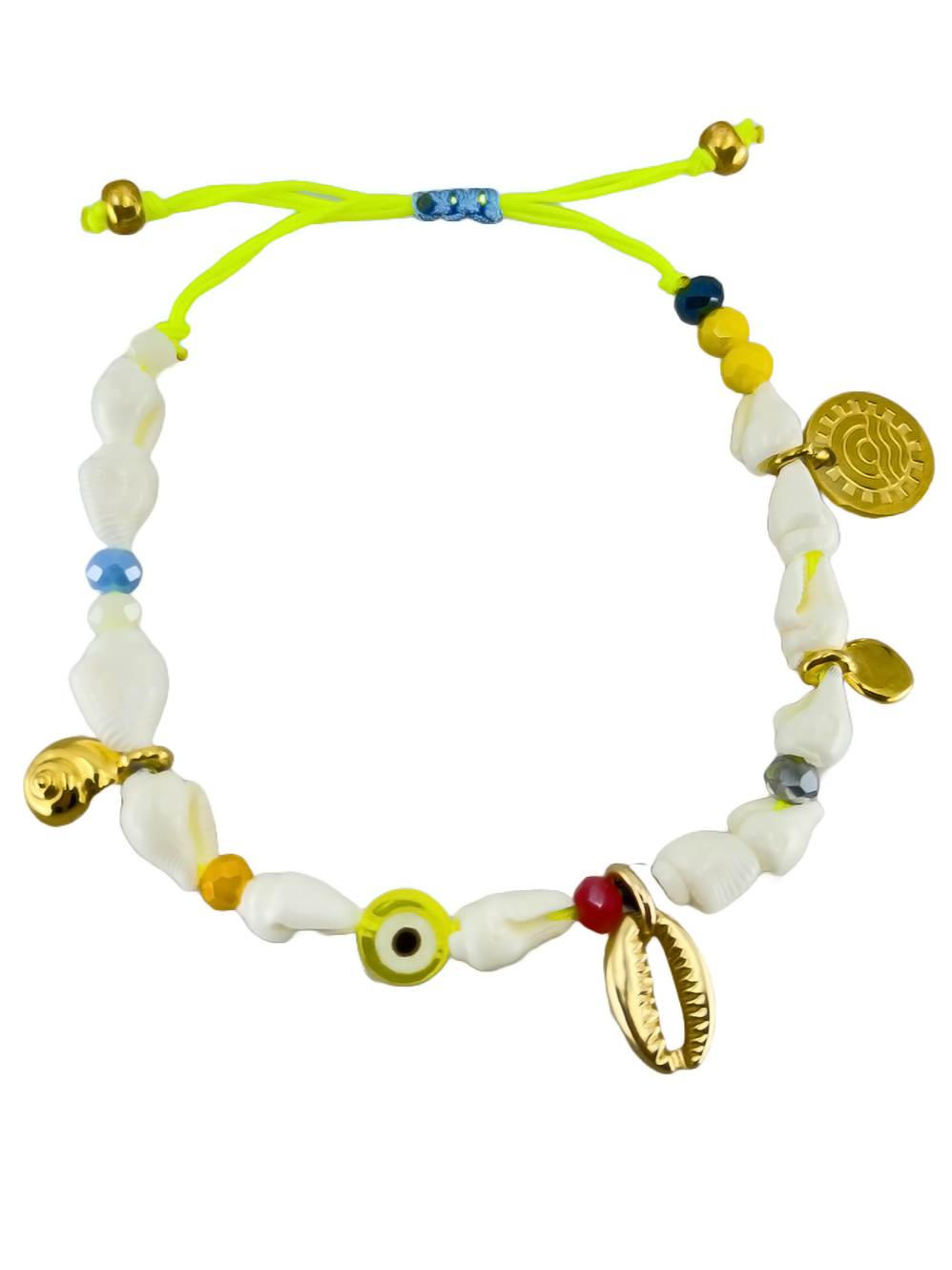 Das Ciao Ragazzi Armband ist mit weißen sowie vergoldeten Muscheln, bunten Perlen und einem grün-gelben Nazar-Auge verziert.