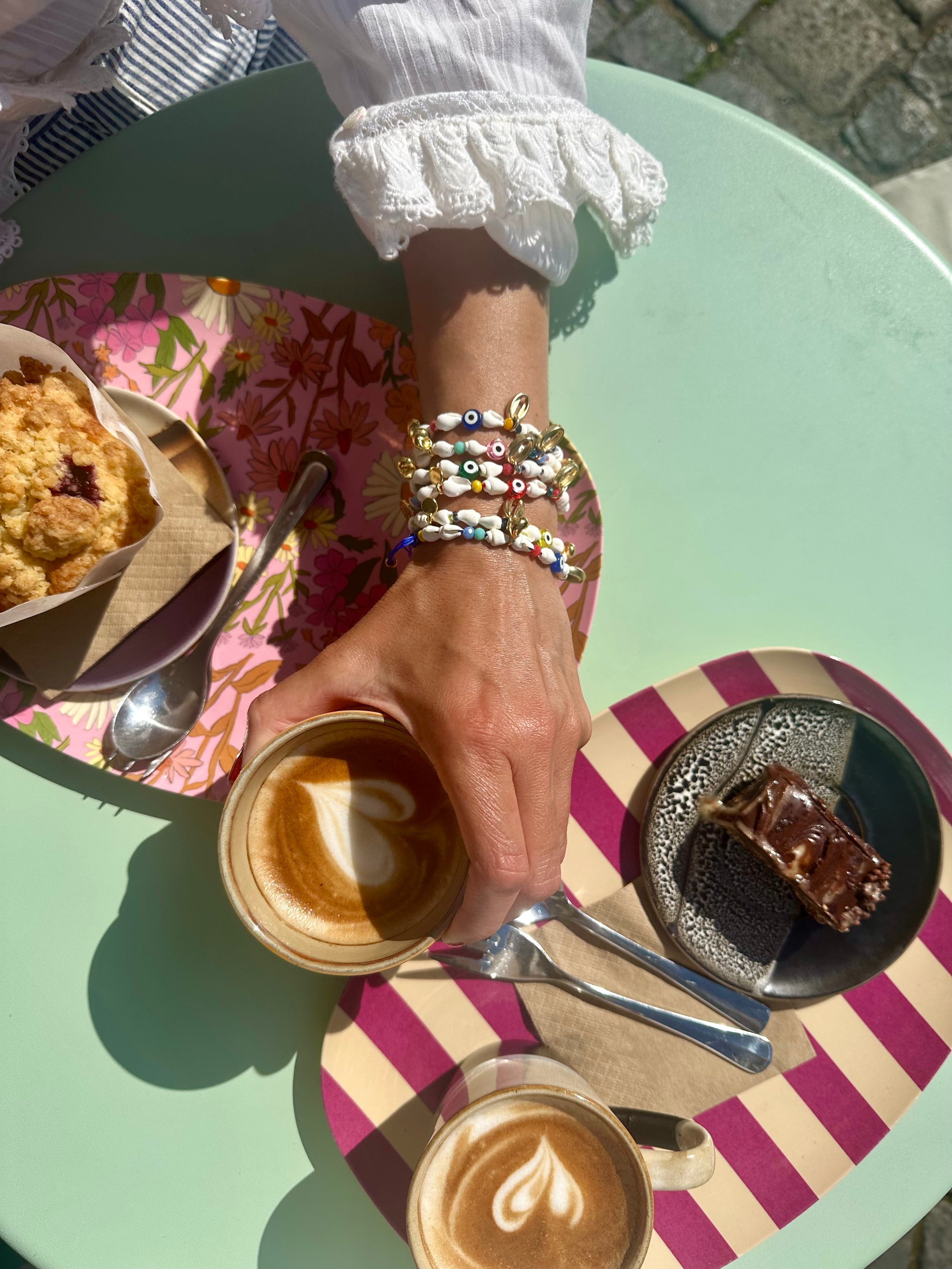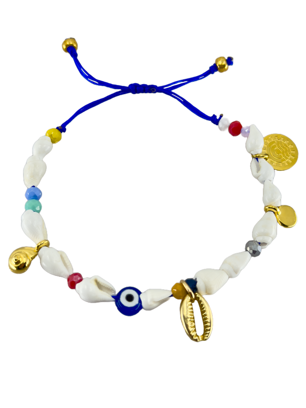 Das Ciao Ragazzi Armband ist mit weißen sowie vergoldeten Muscheln, bunten Perlen und einem blauen Nazar-Auge verziert.