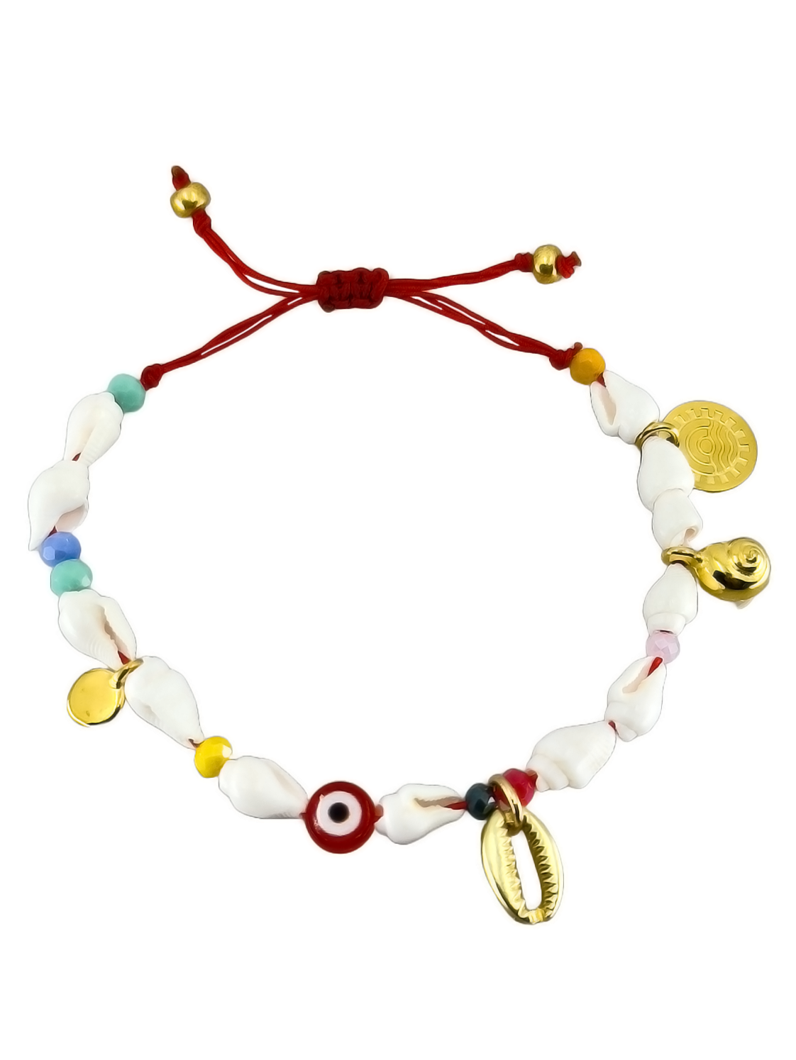 Das Ciao Ragazzi Armband ist mit weißen sowie vergoldeten Muscheln, bunten Perlen und einem roten Nazar-Auge verziert.