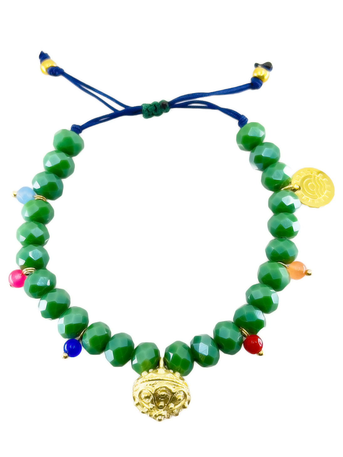 Halte mit dem Armband "Dreamy Olive" einen Hauch von mediterranem Flair am Handgelenk fest! Die grünen und bunten Glasperlen sowie der vergoldete, typische mediterrane Anhänger verleihen jedem Outfit einen tollen Look.