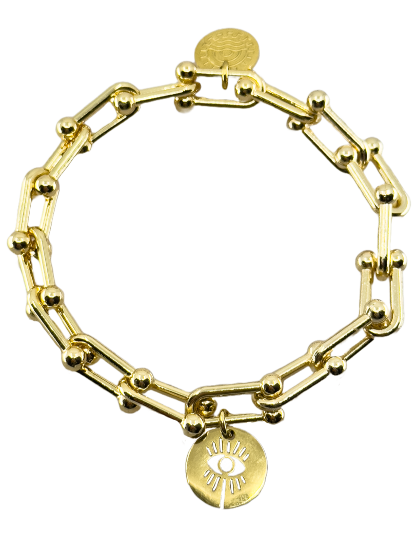 Feiere das Leben mit Happy Hour! Unser goldenes Armband mit einem griechischen Auge-Medallion ist das perfekte Accessoire für jeden Anlass. Lass die Happy Hour beginnen und genieße jeden Moment mit Stil!