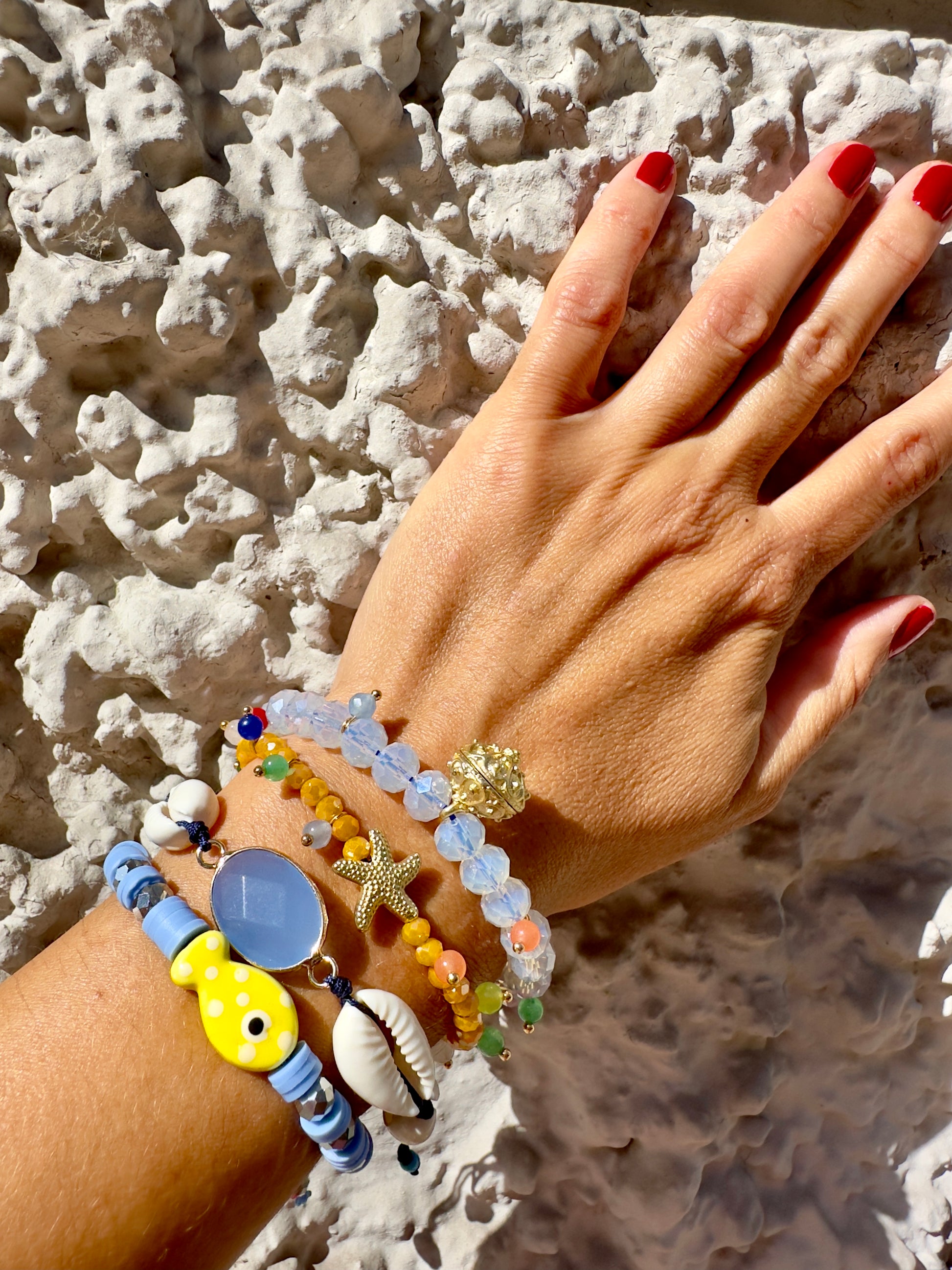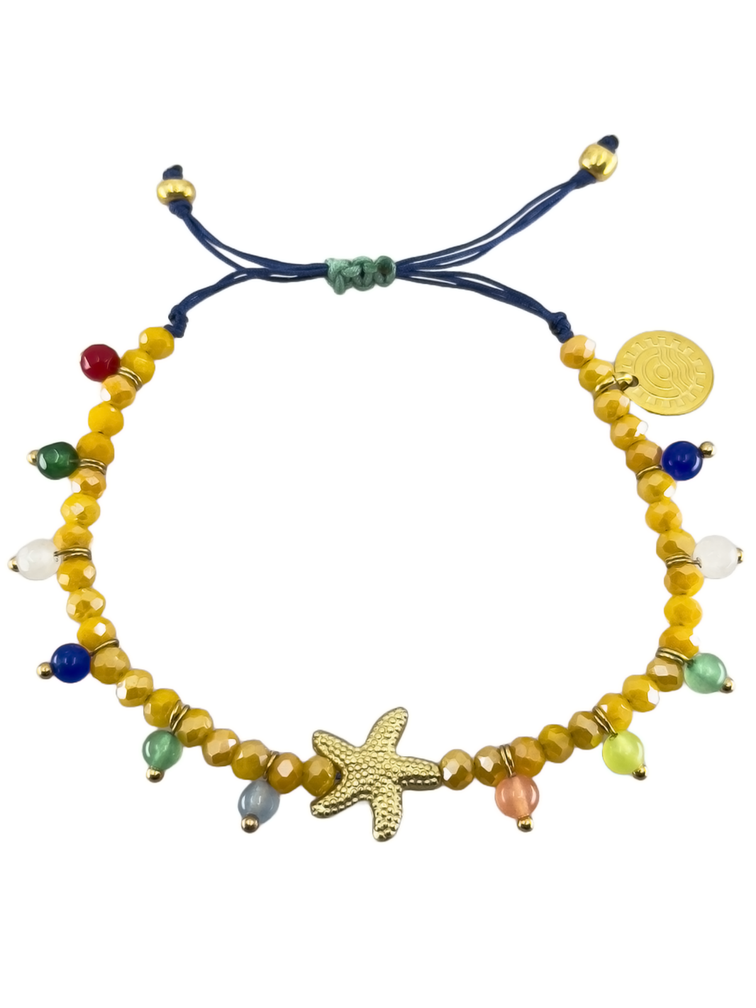 Das "Chose me (to make your day)" Armband ist ein echter Hingucker! Mit einem großen vergoldeten Seestern und kleinen orange leuchtenden sowie bunten Glasperlen, ist es perfekt für den Strand oder einen sommerlichen Tag.