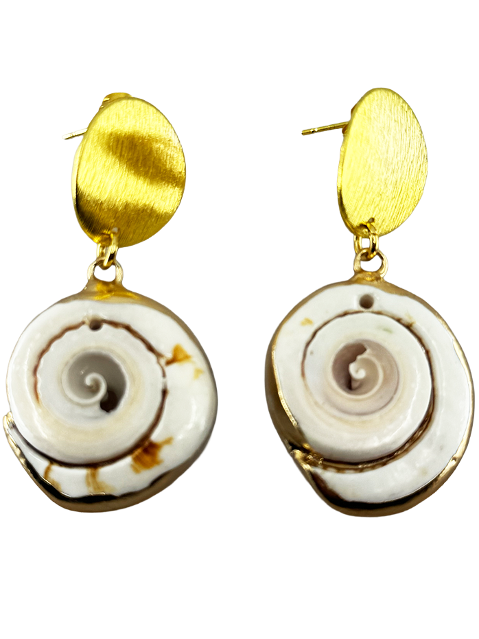 Die Nomadic Soul Ohrringe bestechen durch die harmonische Kombination eines eleganten vergoldeten Plättchens und einer großen sowie weißen Muschel.
