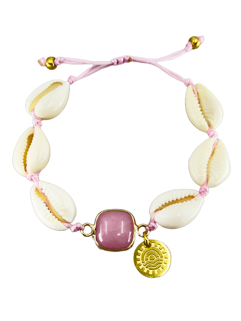 Das "Bubble Gum" Armband verfügt über eine wunderschöne Kombination aus weißen Muscheln und einem rosa Stein-Anhänger. Die perfekte Ergänzung für jedes sommerliche Outfit.