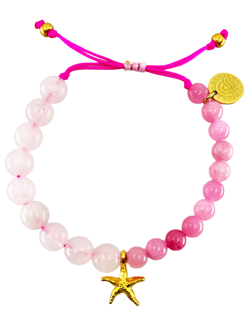Das Armband „Salty but Sweet (pink-rose)“ kombiniert zwei farbige Naturstein-Perlen mit einem vergoldeten Seestern-Anhänger.