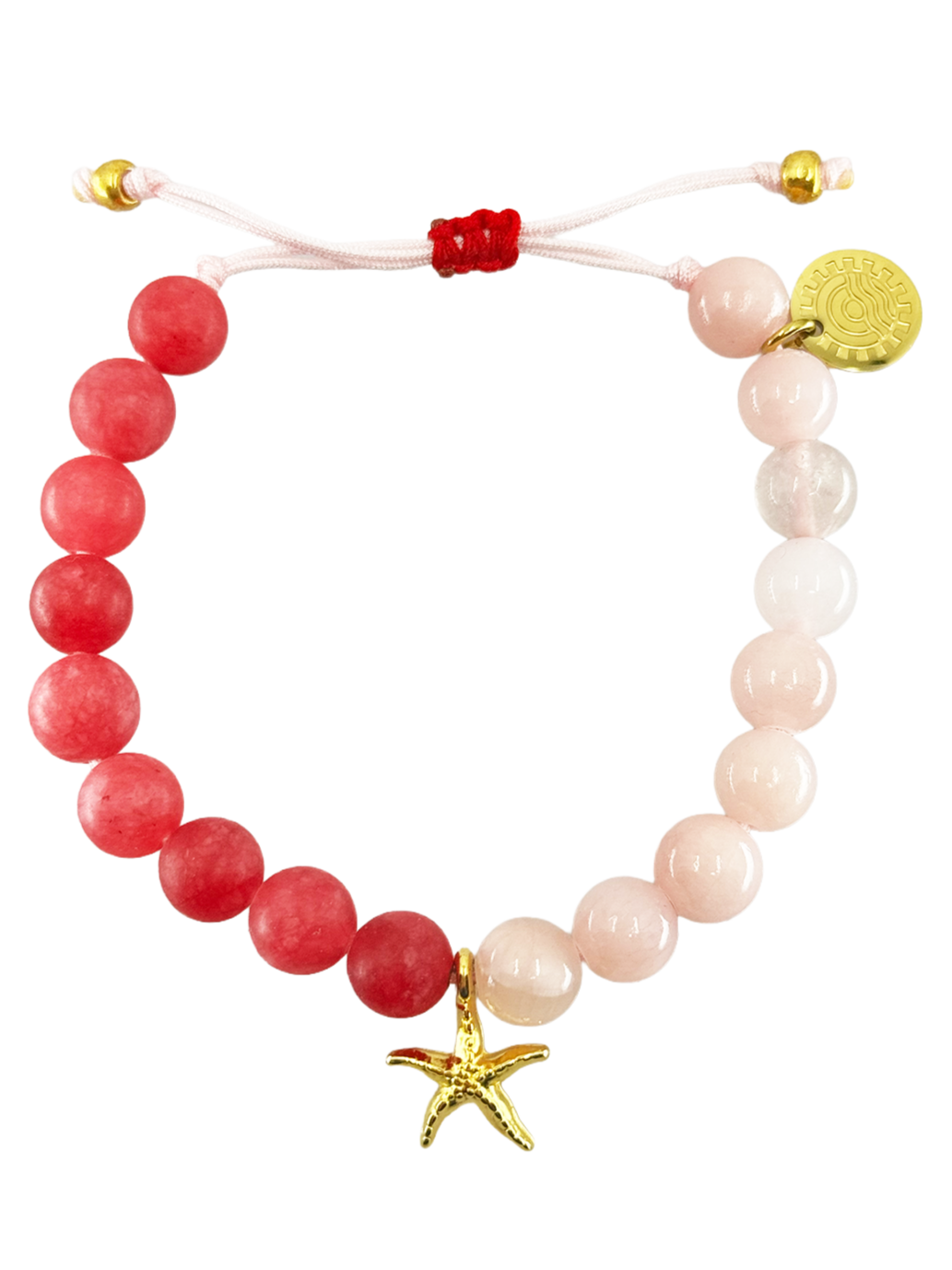 Das Armband „Salty but Sweet (red-rose)“ kombiniert zwei farbige Naturstein-Perlen mit einem vergoldeten Seestern-Anhänger.