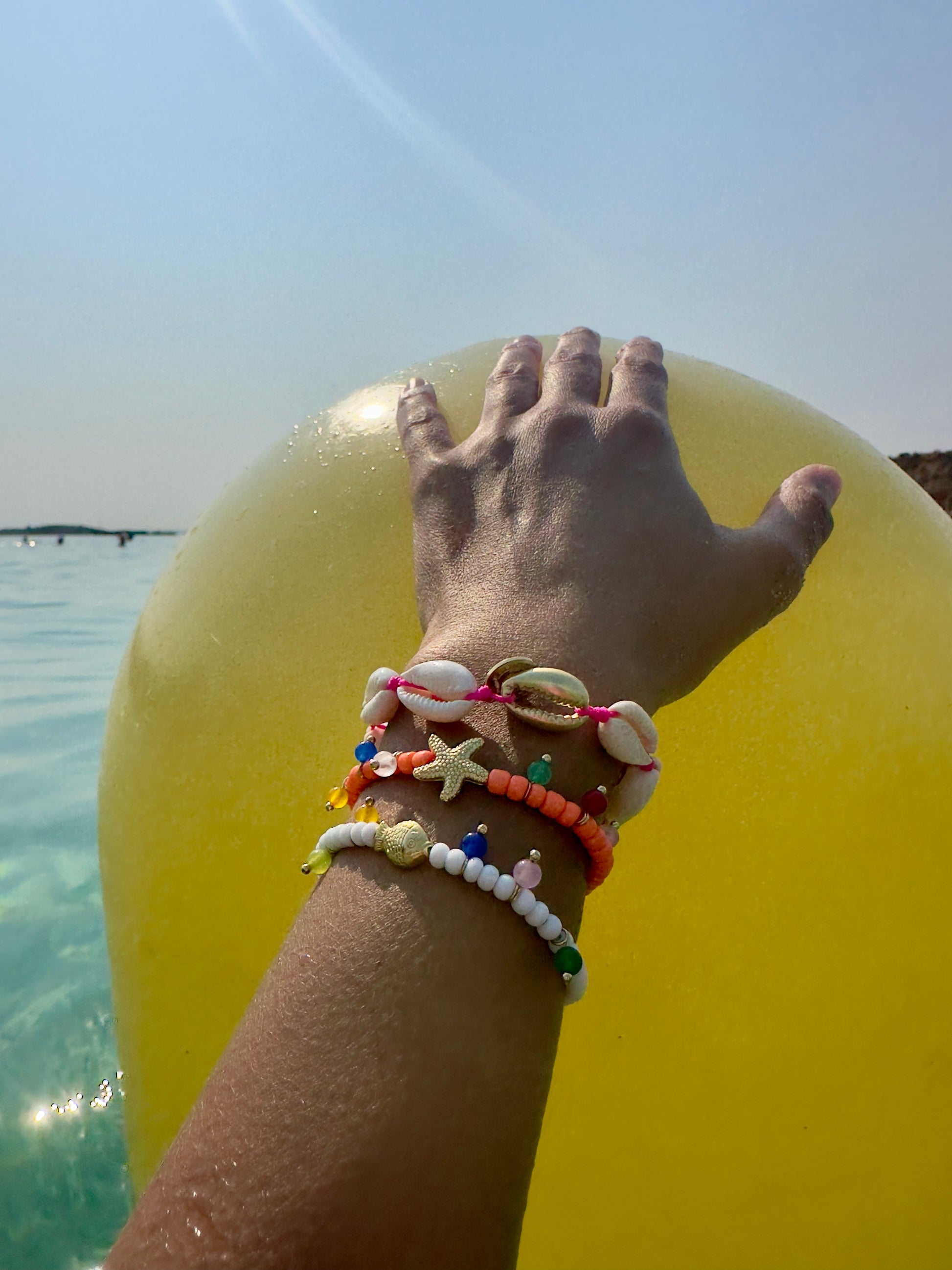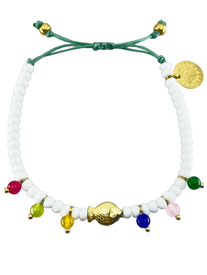 Das Un Tuffo nel Mare Armand mit weißen Perlen und einem kleinen goldenen Fisch, lässt dich stylisch durch den Tag schwimmen.