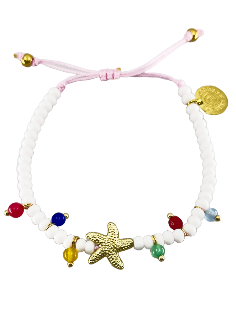 Das "White Berries on the String" Armband ist ein echter Hingucker! Mit einem großen vergoldeten Seestern und kleinen weißen sowie bunten Glasperlen, ist es perfekt für den Strand oder einen sommerlichen Tag.