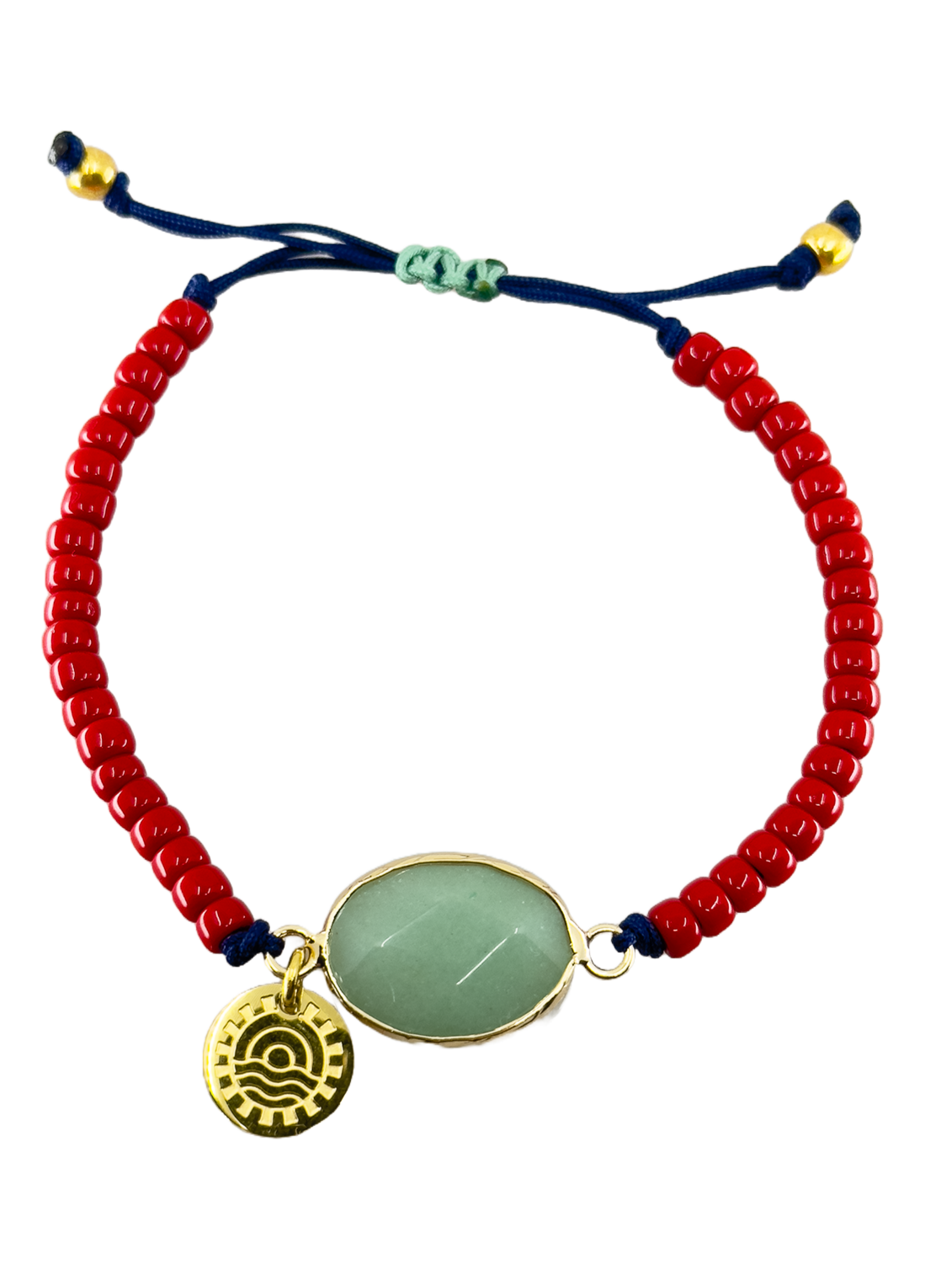 Das Always Sunny Armband verfügt über eine wunderschöne Kombination aus roten Perlen und einem grünen Stein-Anhänger. Die perfekte Ergänzung für jedes sommerliche Outfit.